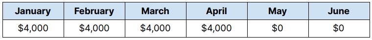 Example: Let's consider Jane, who made $4000 per month from January through April. Jane lost her job and had no income in May and June. If she files for bankruptcy in July, her CMI will be based on the months from January through June, including the two months in which she had no income. An easy way to visualize this is through the use of a table: